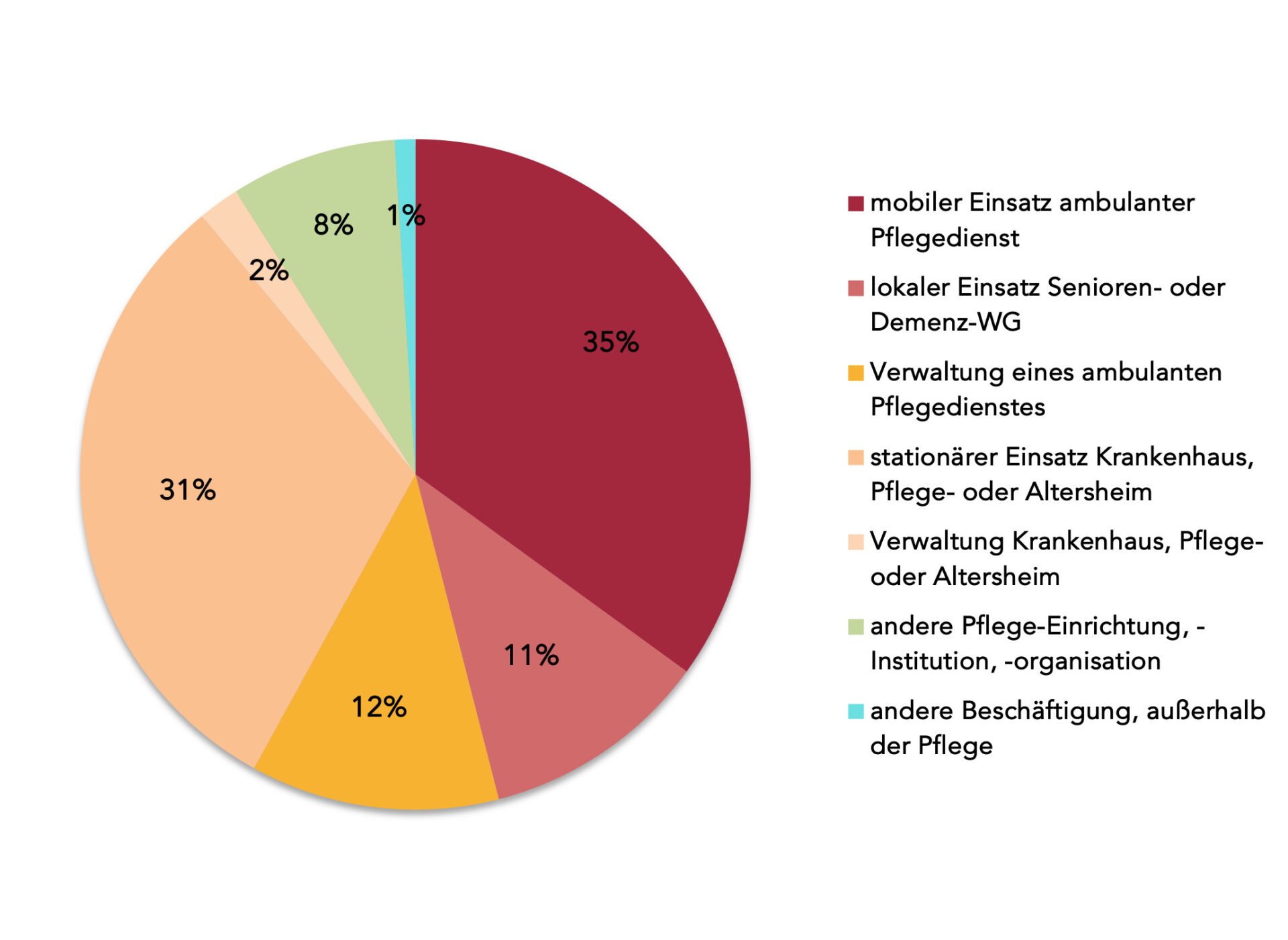 Laut Statistisches Bundesamt arbeiten in Deutschland ca. 1,5 Mio. Beschäftigte in der Kranken- und Altenpflege, davon etwa zwei Drittel ambulant (Pflegedienst, Senioren- und Demenz-WGs) und ein Drittel stationär (Krankenhaus, Alten- und Pflegeheim etc.). Unsere Umfrage erhebt sicherlich nicht den Anspruch repräsentativ zu sein, trifft diese Verteilung wiederum ganz gut. Die Antworten des 1%-Anteils von Beschäftigten, die nicht in der Pflege arbeiten, unterschieden sich nicht wesentlich von den anderen 99% und sind deshalb weiterhin Teil der Auswertung.