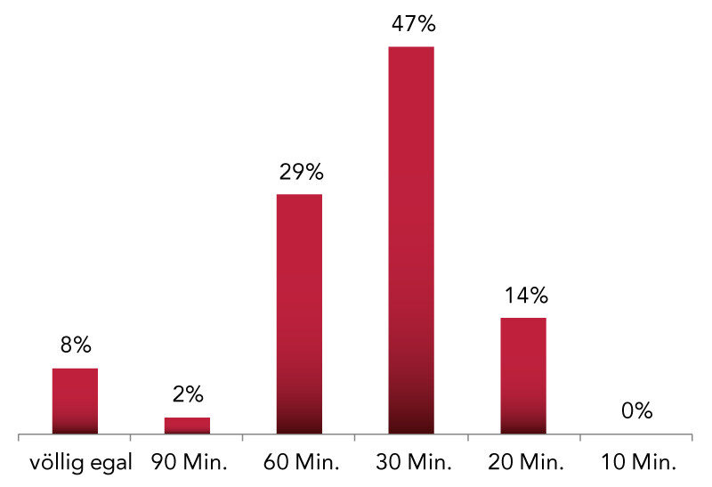 30 Minuten Fahrtzeit werden im Mittel akzeptiert (47%), 39% halten sogar eine Fahrtzeit von 60 Minuten oder länger für zumutbar. Einen kleinen ‚Ausreißer‘ stellen die Beschäftigten im mobilen Einsatz dar, die zu 30 Minuten oder weniger tendieren. Dies mag damit zusammenhängen, auch während des Jobs viel auf der Straße unterwegs zu sein.