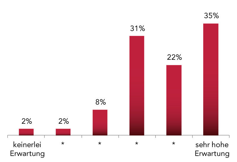 88% erwarten von Vorgesetzten / vom Arbeitgeber auch persönliche Anerkennung zu erfahren, 35% verbinden dies sogar mit einer sehr hohen Erwartung. Beschäftigte im stationären Einsatz sehen dies etwas gedämpfter, Beschäftigte in einer Senioren-/Demenz-WG tendieren hier zu sehr hohen Erwartungen.