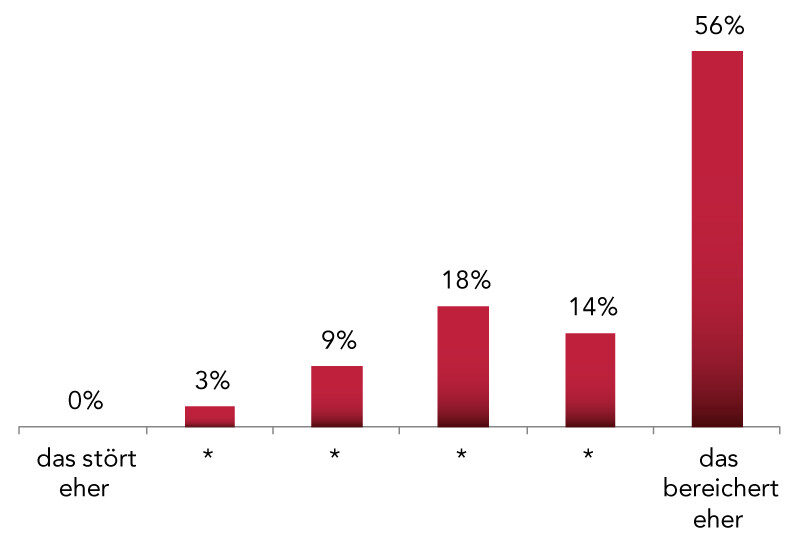 88% stehen einer „bunten Mischung“ im Kollegenkreis positiv gegenüber, 56% sehen hierin sogar eine Bereicherung. Dies wird in allen Beschäftigungsarten gleichermaßen so gesehen.